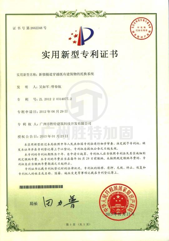 新修隧道穿越既有建筑物的托換系統(專利號ZL201220314077.2)-廣州市勝特建筑科技開發有限公司加固專利技術、專利證書展示,科技成果展示.我司專注于地基基礎加固,擋土墻加固工程等工程設計及施工,多年來申請了多種特種工程技術專利.公司加固技術實力雄厚,獲國家高新技術企業認證!歡迎廣大客戶來電咨詢或到我司考察.